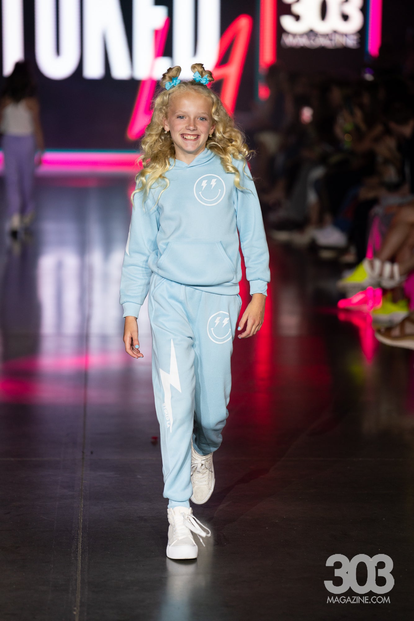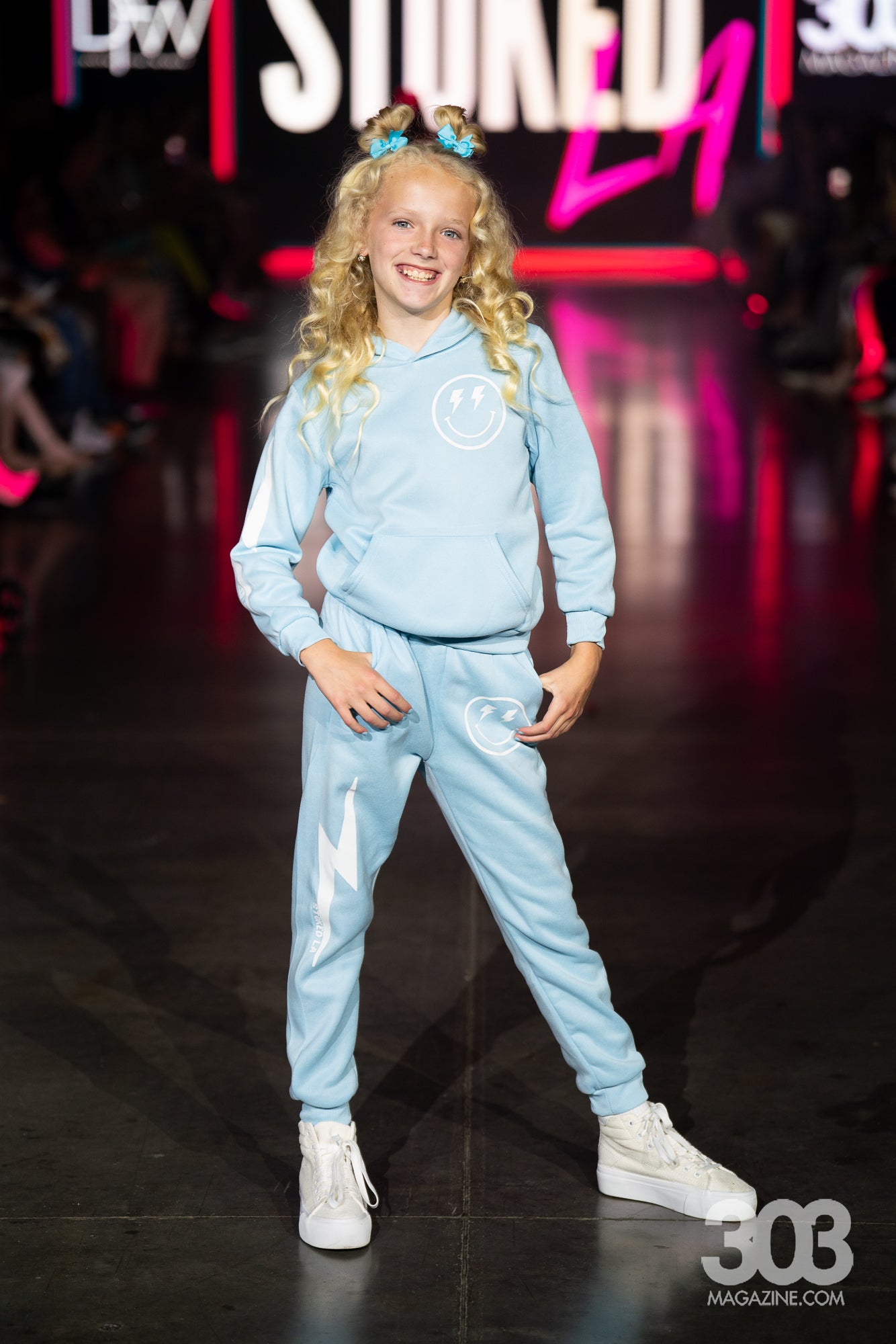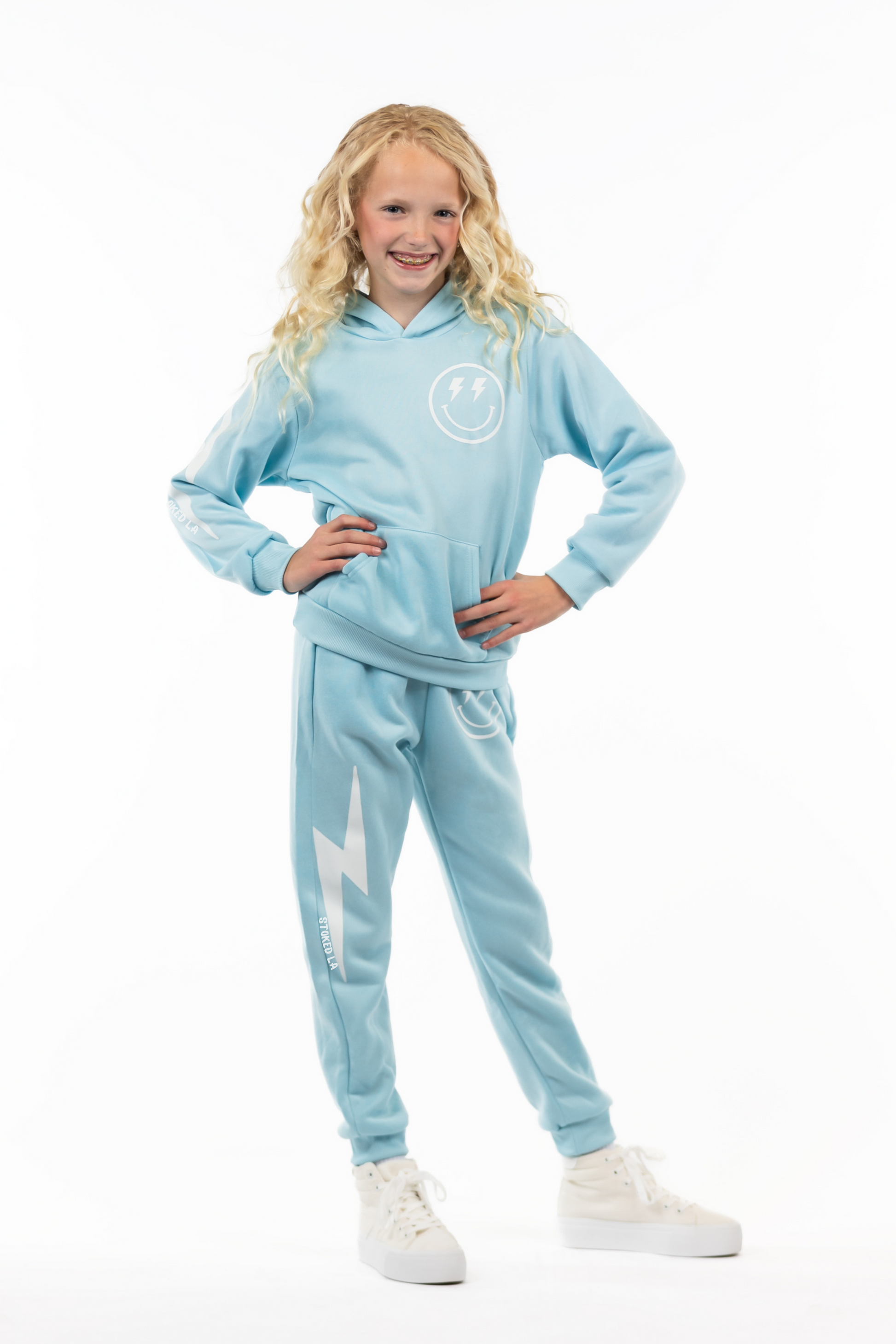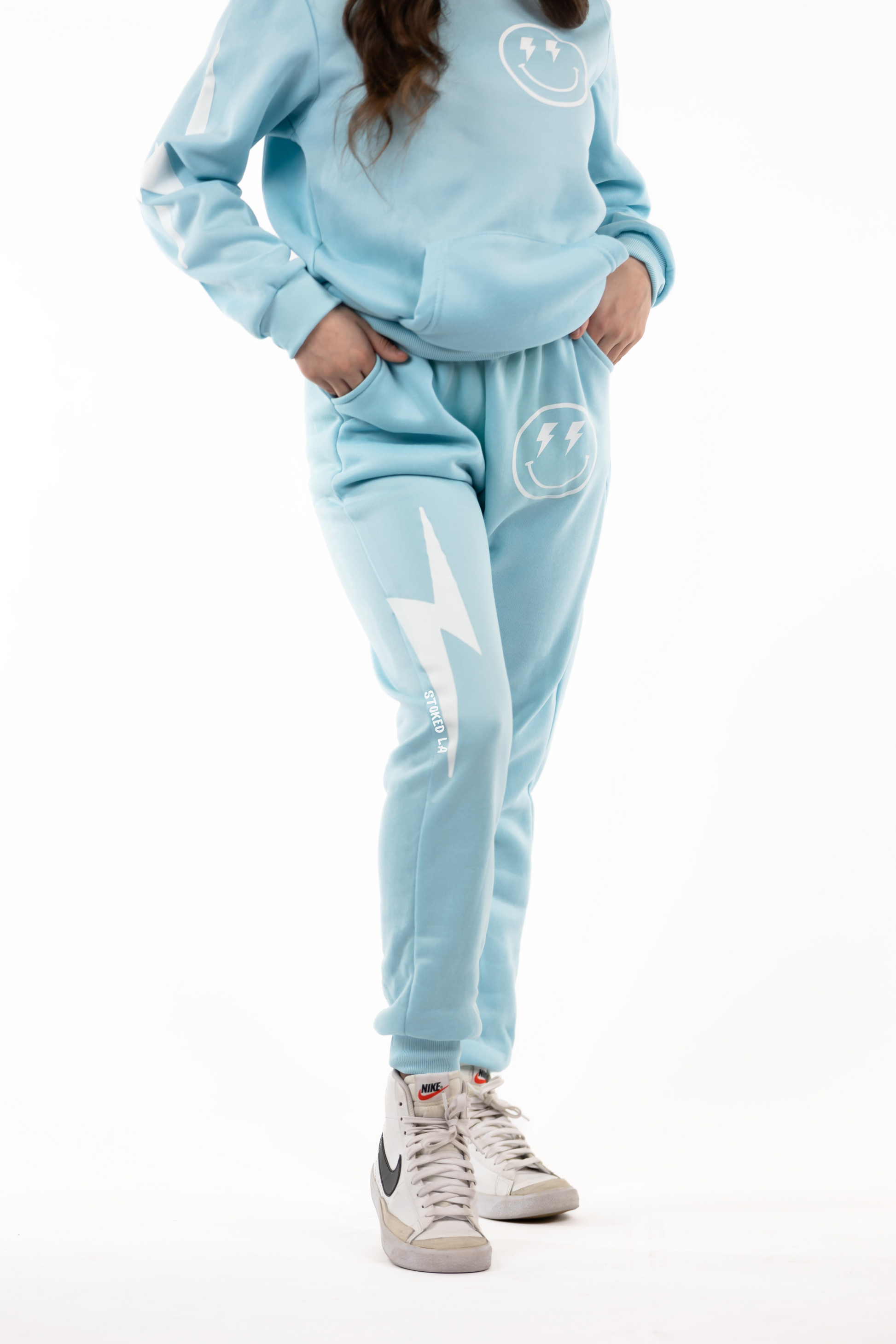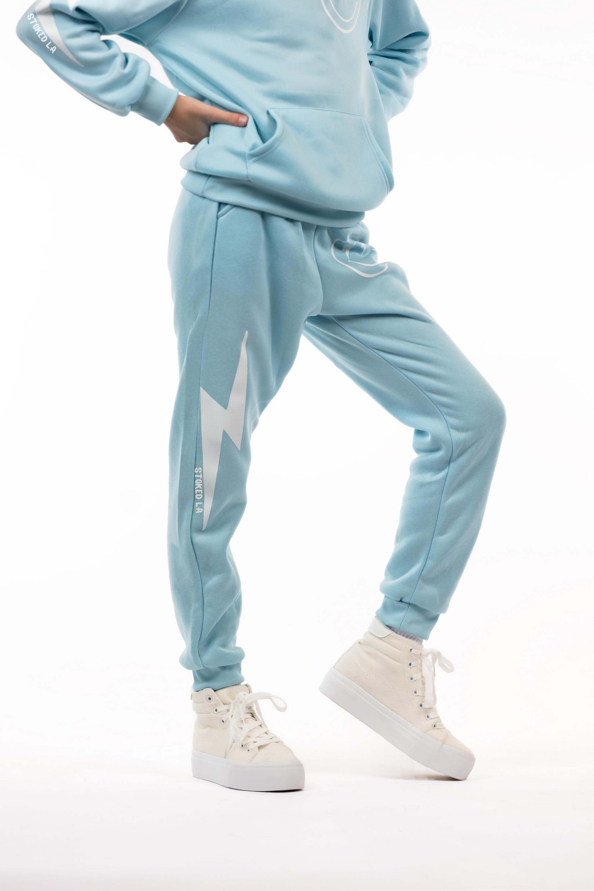 Light Blue Sweatpants with lightning eye smiley face 4" on pocket and lightning bolt 12" with Stoked LA text down the leg 3"